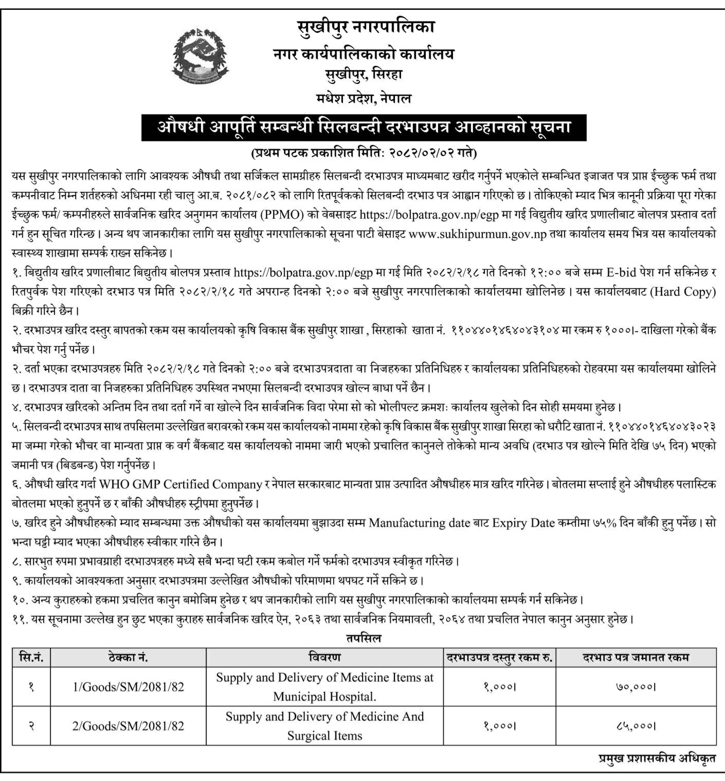 औषधी आपूर्ति सम्बन्धी सिलबन्दी दरभाउपत्र आव्हानको सूचना, Invitation for Sealed Quotation